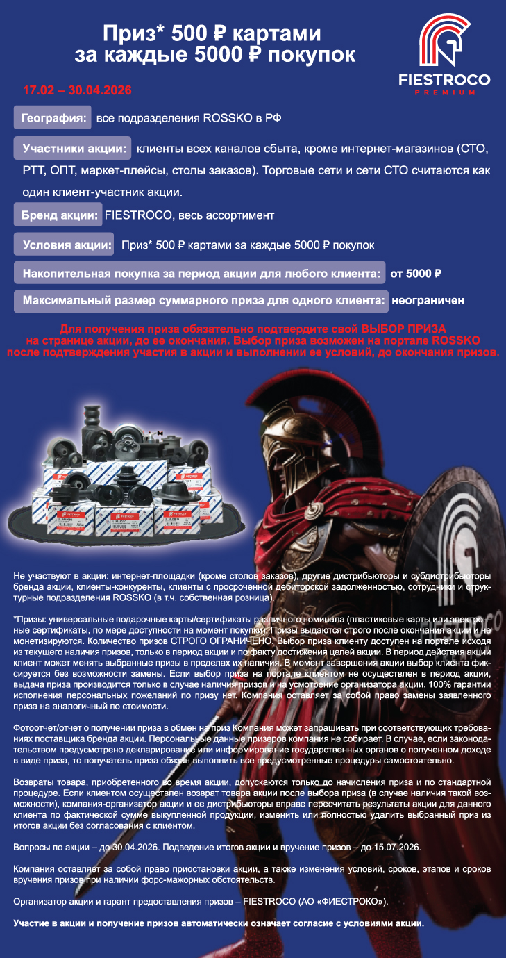 17.02 – 30.04.2026 Акция "Приз* 500 ₽ картами за каждые 5000 ₽ покупок FIESTROCO"